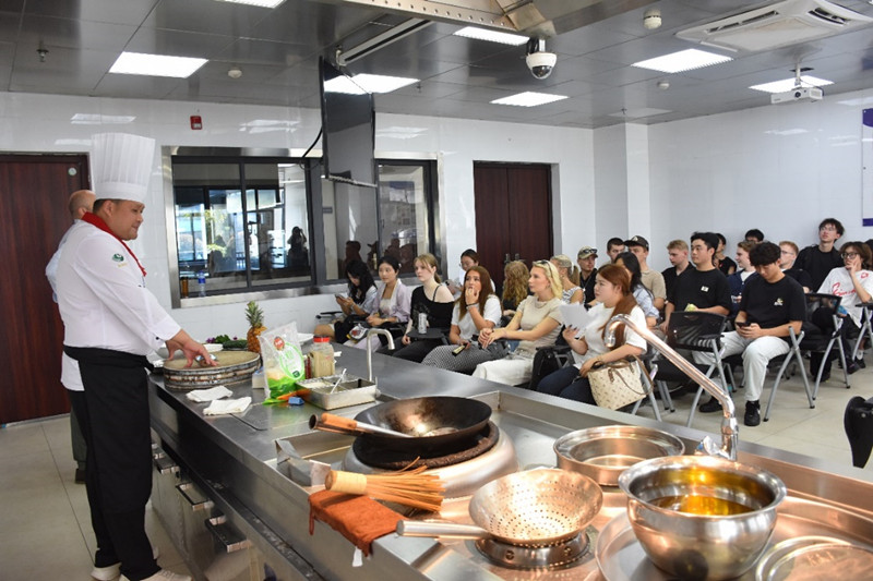 在旅游学院实验室,黄玉海老师给丹麦学子现场制作经典中式菜肴“菠萝咕咾肉”,展示了精湛的烹饪艺术,让他们在烟火气中品味中华饮食文化的精妙。