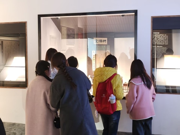 在黄山市徽文化博物馆,同学们跟随讲解员的引导,沿“天下徽州”“遥忆徽州”“寻根徽州”等主题展厅徐徐前行。从精雕细刻的徽州三雕、绚丽细腻的徽州漆器,到意境高远的新安画作、充满生活气息的民俗器物,每一件展品都在静静讲述徽州千年文脉。同学们频频驻足,深入了解了徽州文化的起源、发展与传承,切身感受到徽商精神、新安理学等文化精髓的独特魅力。