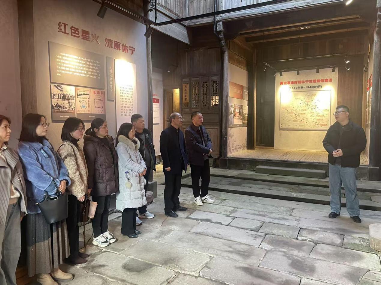 走进休宁县红廉展示馆,红色展厅内的历史照片、文献资料与实物展品徐徐展开一幅波澜壮阔的革命画卷。在讲解员的引导下,党员教师们循着历史脉络,了解了从“五四”时期新文化思想在休宁的传播,到北伐军进军休宁、中共休宁县委建立的曲折历程,深刻感悟了革命先辈为民族独立、人民解放浴血奋战的坚定信念与初心使命。休宁作为革命老区,红色基因早已融入血脉。