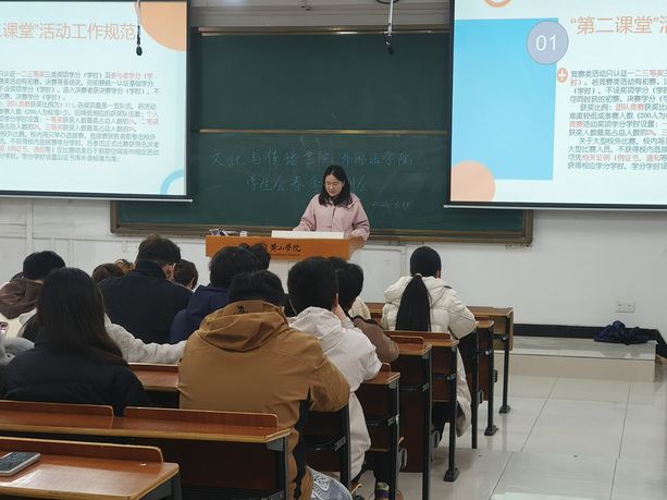 在主题分享环节,三位主讲人依次登台三位主讲人依次登台,带来干货满满的经验分享:文化与传播学院王亚辰围绕微推制作、新闻稿撰写与摄影技巧展开讲解,从内容排版、文字逻辑到构图用光,细致拆解新媒体宣传的核心要点,帮助同学们掌握实用的宣传技能;betway必威西汉姆联官网高静怡则聚焦第二课堂活动的学时学分规定,清晰解读学分认定标准、活动参与流程与注意事项,为同学们规划实践路径提供了明确指引;betway必威西汉姆联官网杨玉璐重点介绍了betway必威西汉姆联官网三大经典品牌活动——“舞动青春”广场舞、“向日葵”英语角与“向日葵”辅导站活动,生动讲述各类活动的开展形式与育人意义,展现学院丰富的文化氛围与育人特色。